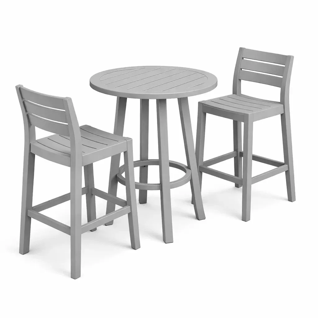 Ensemble composé d'une table et de deux chaises en bois composite résistant aux intempéries.